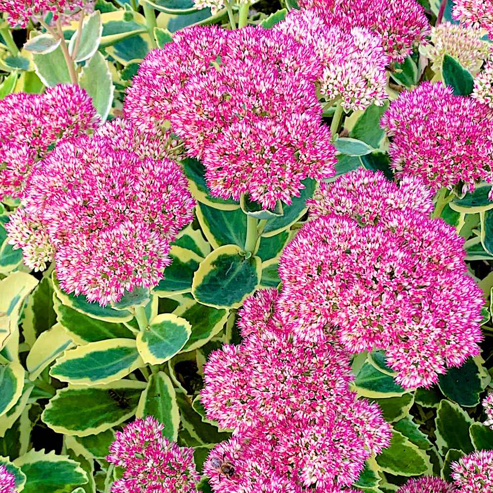 An NWP introduction A clump-forming perennial with green leaves edged in creamy yellow. Large heads of dusty-rose flowers mature into reddish-brown seedheads for the winter. . Flowers August to October. Attracts butterflies. Full sun, well-drained soil. Hardy. 40cm x 60cm